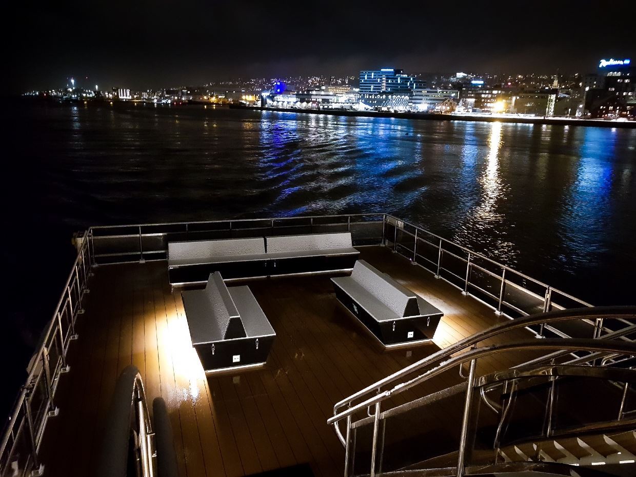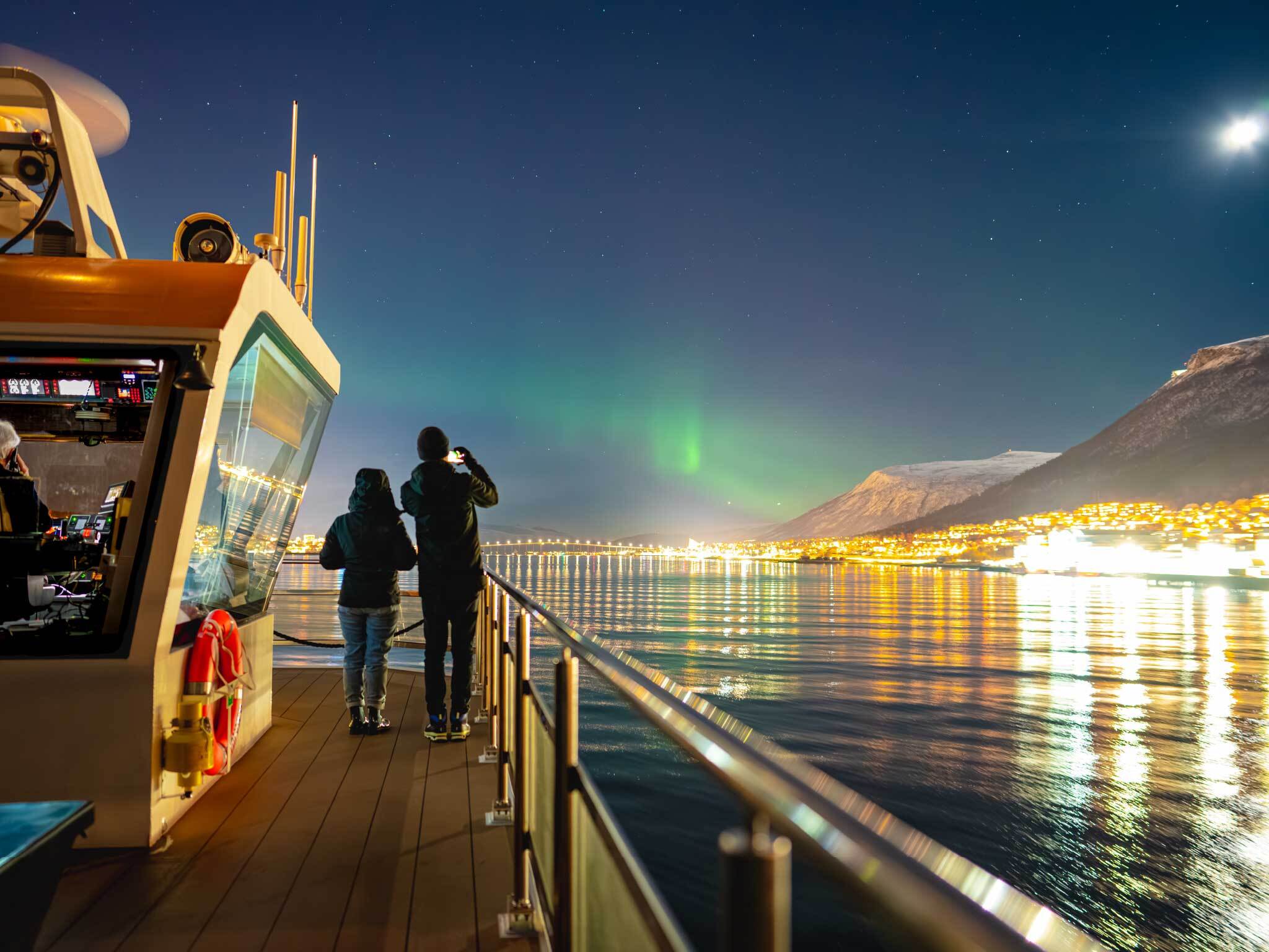 18:45 (6:45PM) directly at the boat, at the pier to the side of Skarven Kro Restaurant in Tromsø (Kaigata 6)