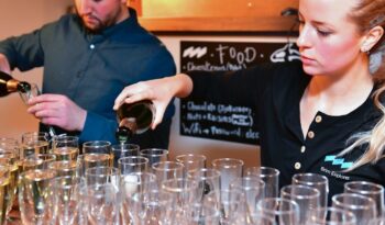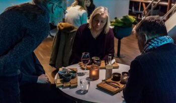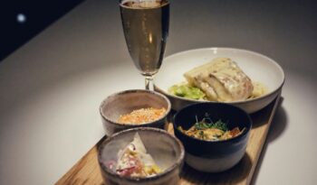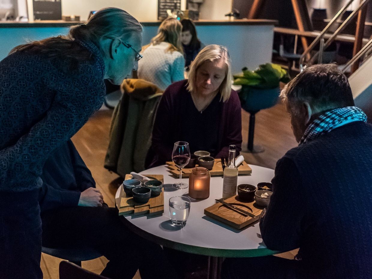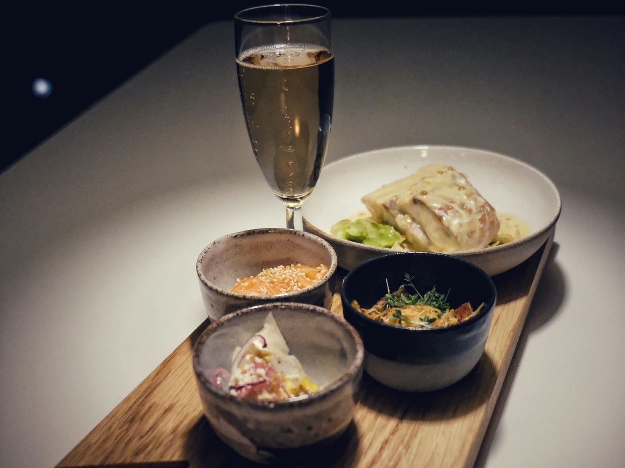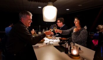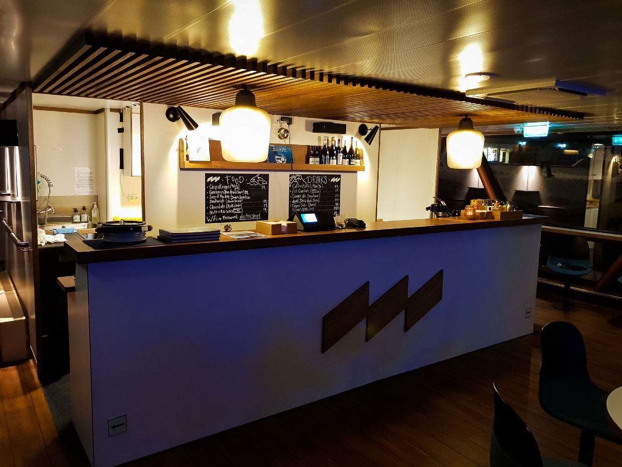 Begin your evening at 18:45, when the doors open to our floating restaurant in Tromsø. Shortly after boarding, you’ll depart the city and cruise silently into the darkness of the Tromsø fjords aboard an electric vessel designed for a peaceful Arctic experience. Settle at a table beside panoramic windows and enjoy the calm atmosphere as you sail through the frozen landscape. You can order a local craft beer from Graff or choose from a selection of carefully curated wines while taking in the views of the surrounding fjords.