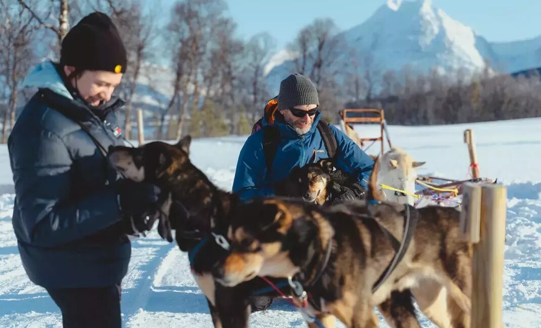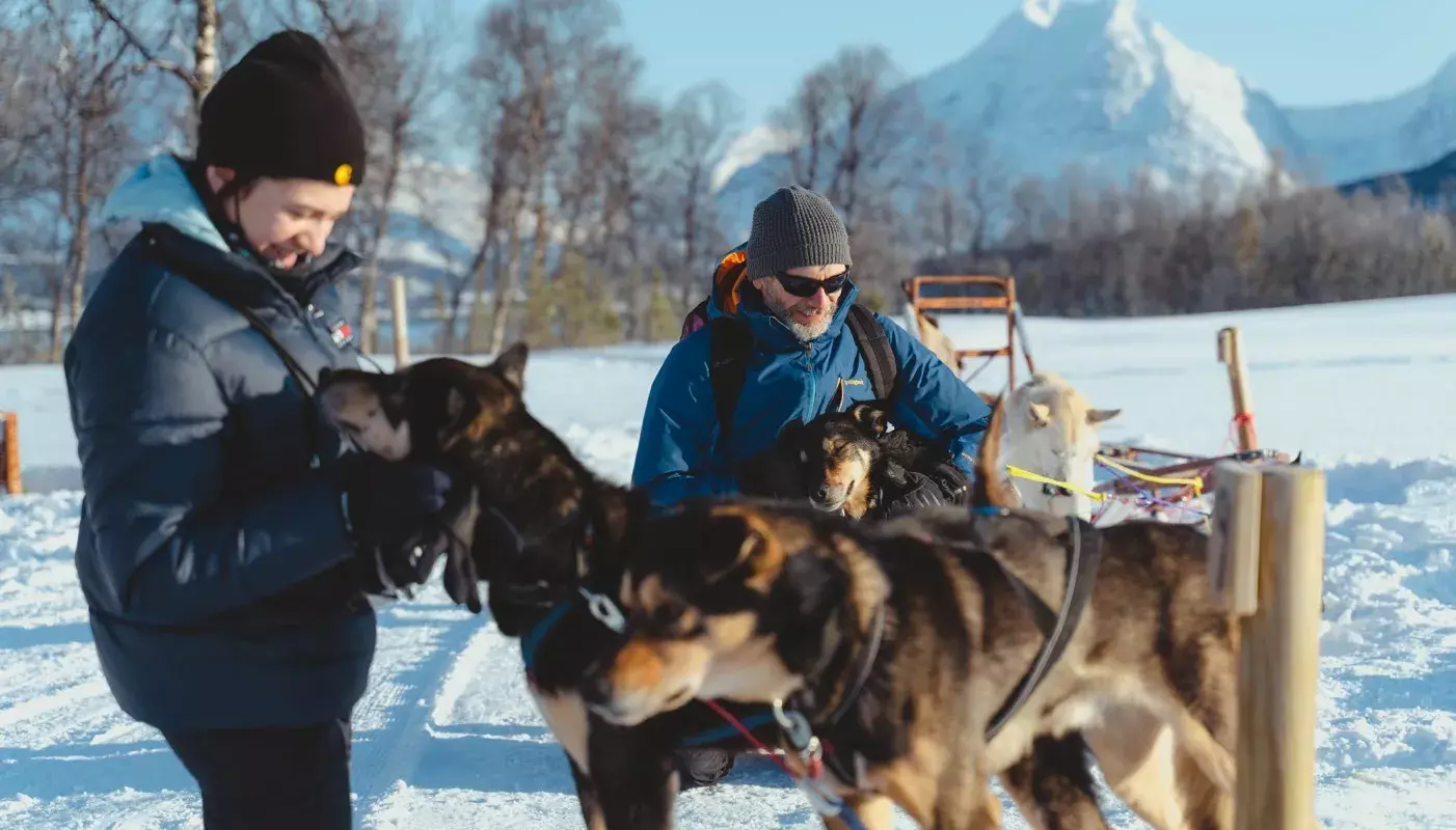 Upon arrival at our camp, situated in a picturesque valley close to the sea, you will be welcomed by our friendly staff, and we will provide you with thermal suits, winter boots, hats, and mittens before heading out on the dog sledding adventure. Before meeting your team of huskies, your guide will go through the safety instructions and show you the basics of steering the sled.