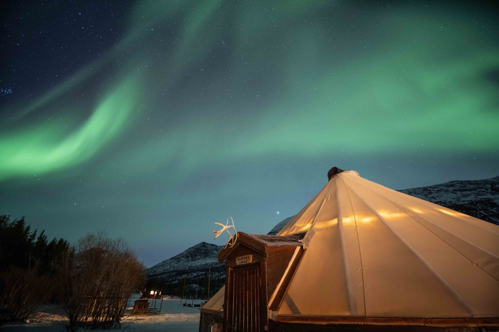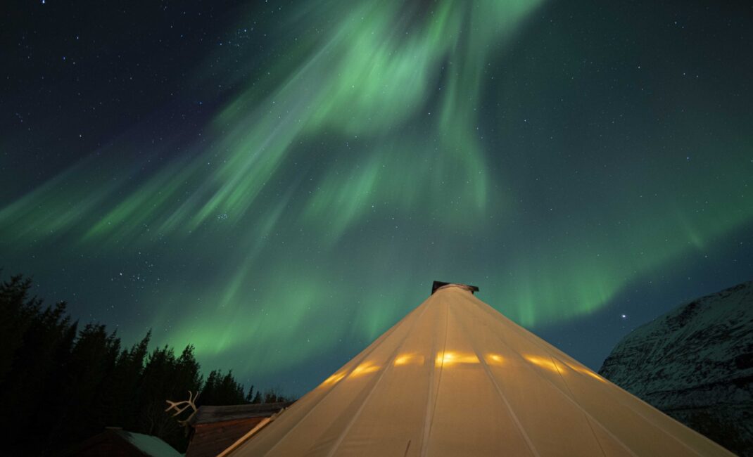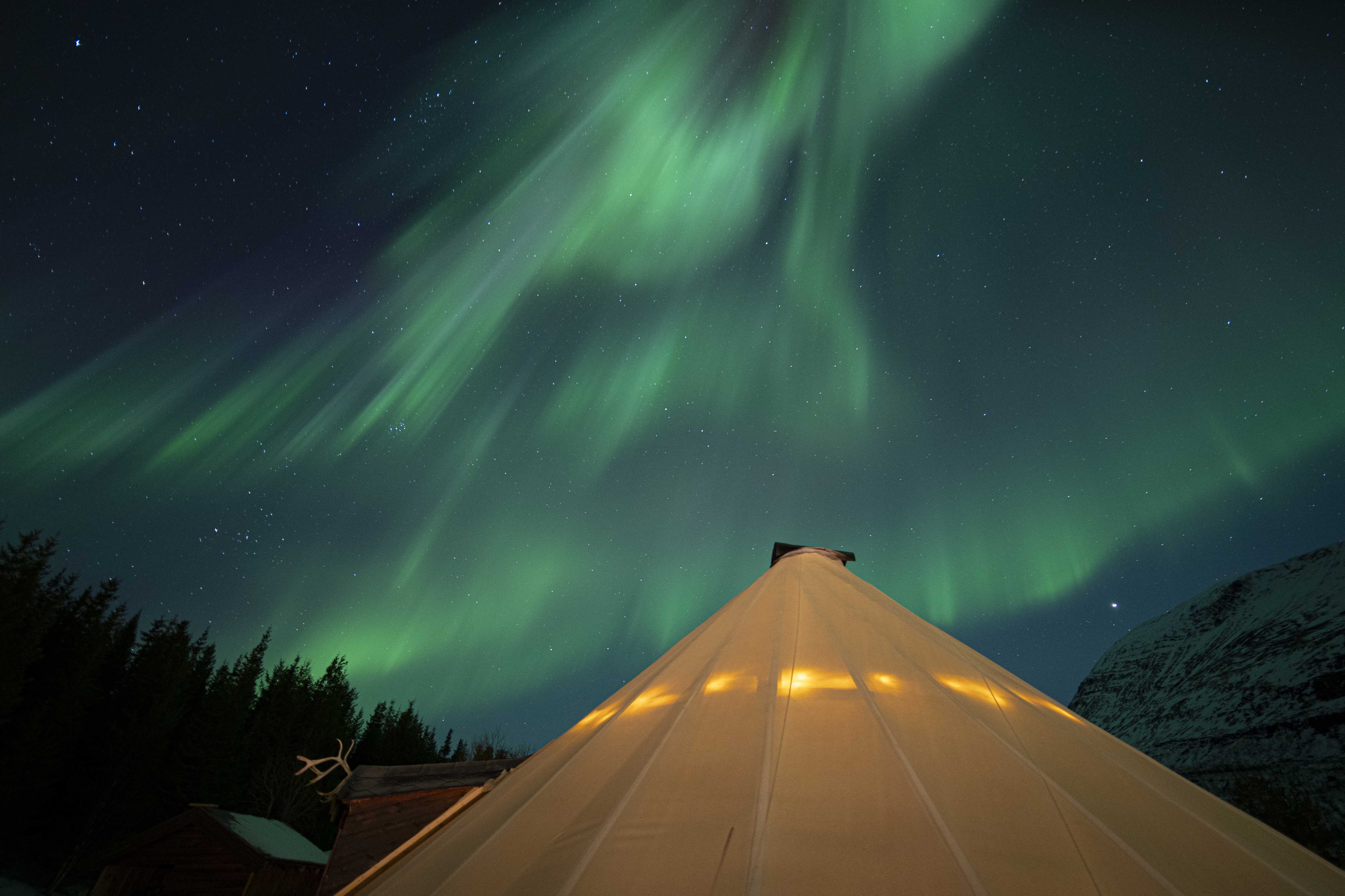 The camp itself is located in untouched wilderness surrounded by darkness, far removed from the bright city lights. The area lies in a drier climate zone with clear inland mountain weather generating many cloud-free night skies in winter.