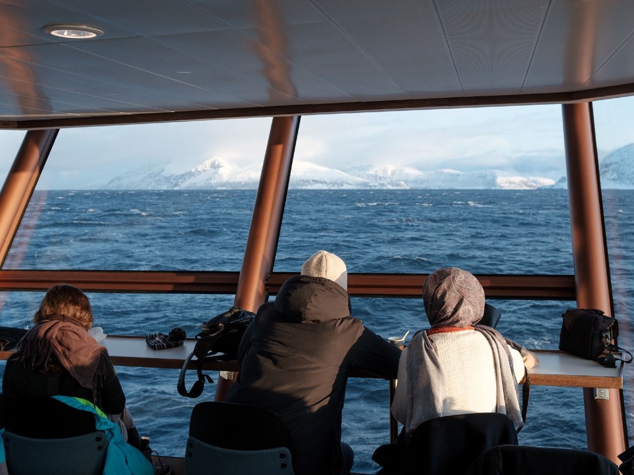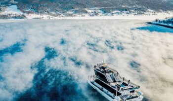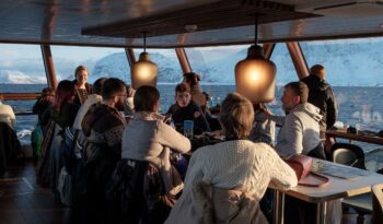 Next, we sail towards the island of Rya, home to a quaint fishing facility, where you will disembark for a short visit. Explore two small museums, a traditional drying rack, and learn how cod fishing and skrei shaped Northern Norway’s culture and economy. Exhibits include old tools, dried cod, historical photos, and fishermen’s clothing you can examine up close. Before returning on board, enjoy a local tasting featuring dried fish, roe, or another seasonal bite.