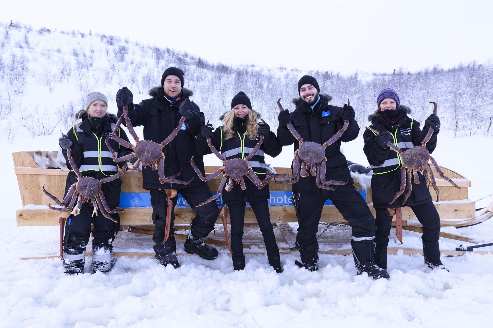 During wintertime you can join a snowmobile tour out on the fjord ice where you pull up the crab pots through a hole in the ice. All of our tours end with a delicious crab meal served in Snowhotel Kirkenes’ authentic boathouse restaurant. The crabs we serve are caught wild and fresh, with your help, straight from the sea, into the casserole and onto your plate.