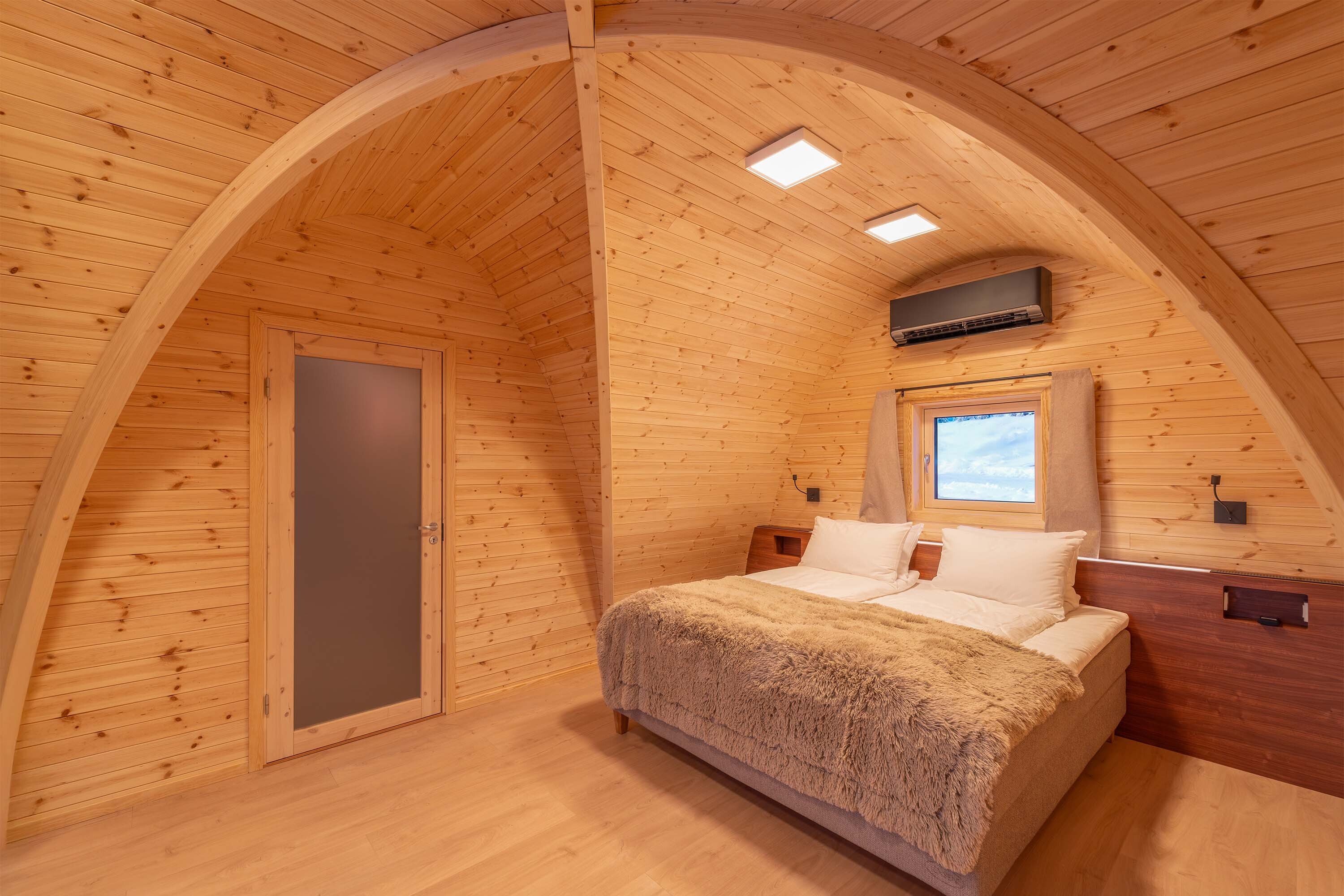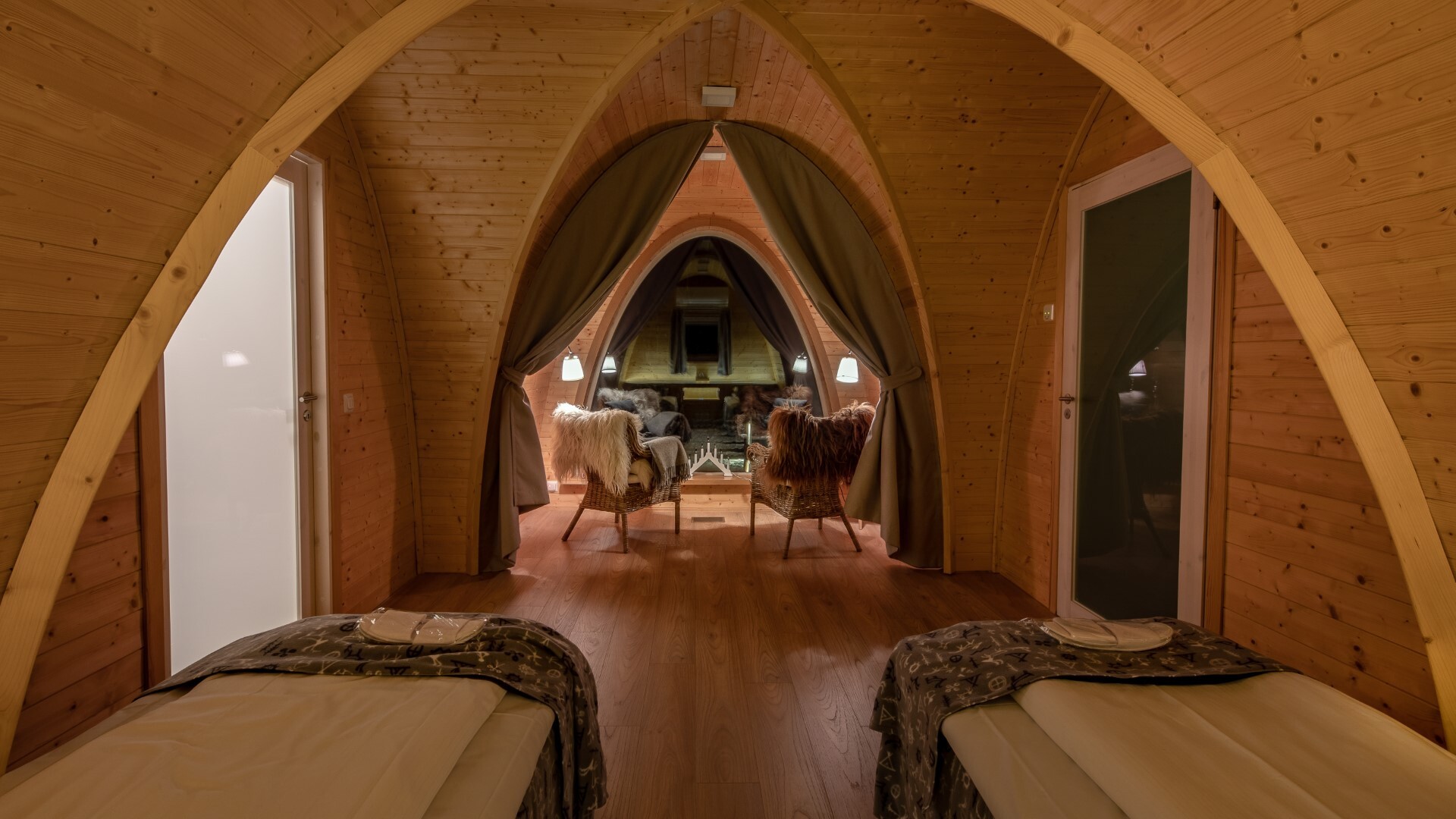 Innvendig har hyttene et eksklusivt treinteriør og raffinerte detaljer inspirert av nordiske designtradisjoner. Atmosfæren er varm, rolig og eksklusiv, ideelt for gjester som søker ro uten å ofre komfort. Til tross for den fredelige beliggenheten, ligger hyttene innen rekkevidde fra restauranten, aktivitetsområder og guidede opplevelser, og tilbyr den perfekte balansen mellom tilbaketrukkethet og tilgjengelighet.