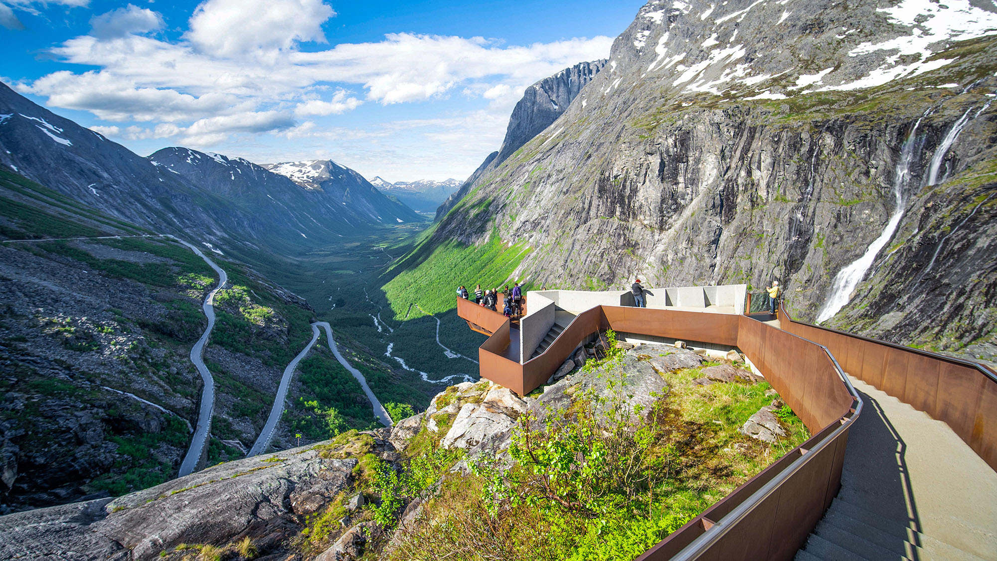 Rampestreken er en av de mest populære turene i området. Gå ut på stålrampen som strekker seg rett ut i luften og nyt den spektakulære utsikten. Fra dette utsiktspunktet ser du ut over Romsdalshorn og de ikoniske toppene i området.